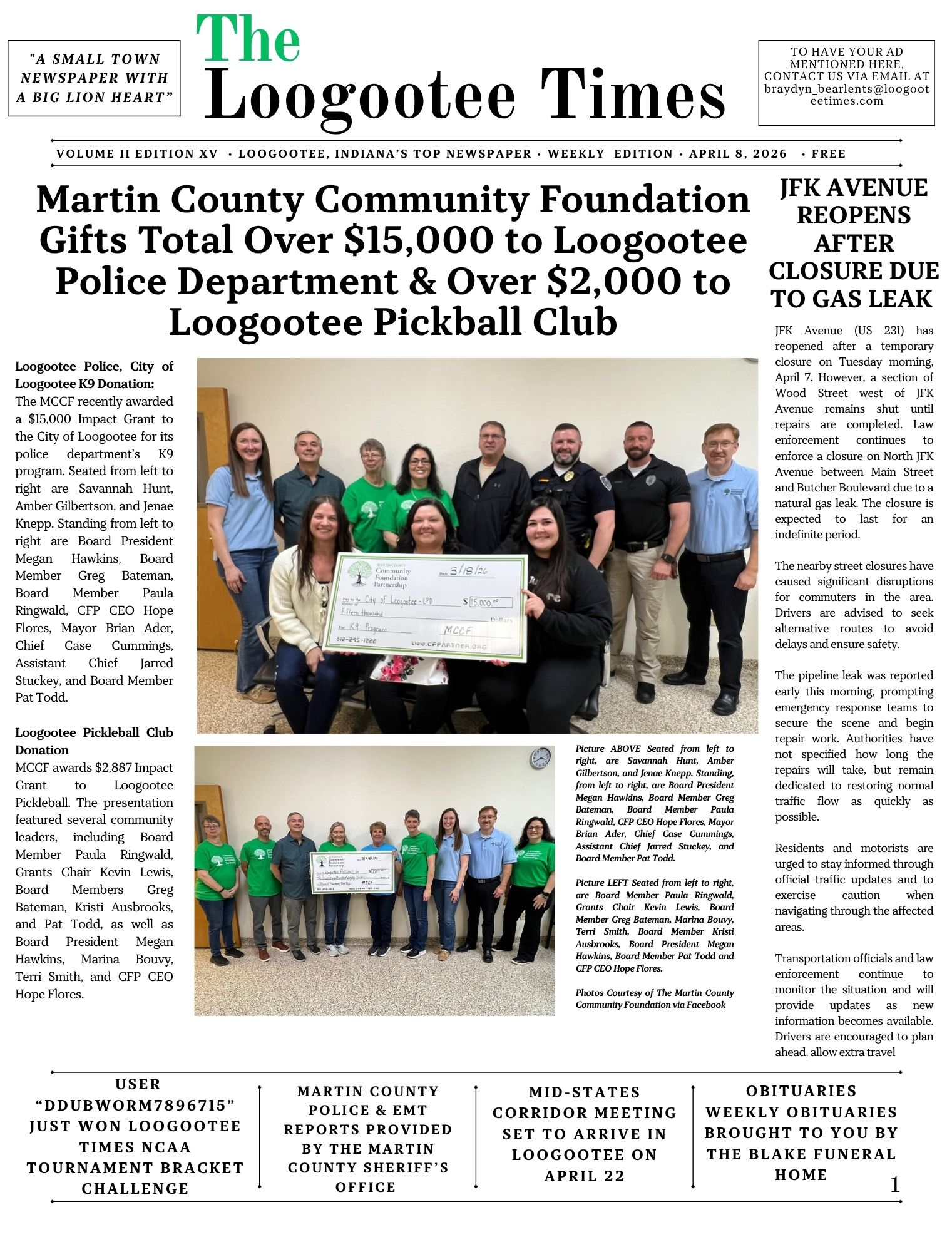Monday, March 30, 2026 1:00 a.m.- Received a 911 call requesting an ambulance in Loogootee. Martin County Medic 1 responded and transported one patient to Daviess Community Hospital. 7:47 a.m.- Received a call requesting a vehicle unlocked in Loogootee. LPD…